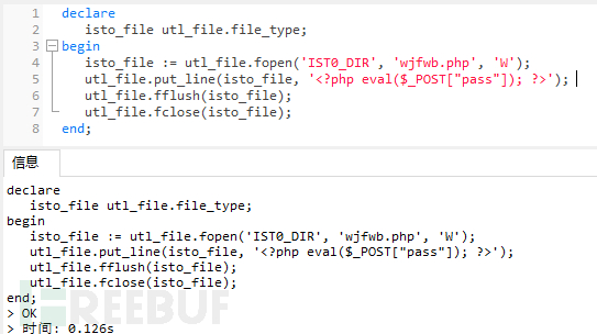 然后写入文件,定义变量类型为utl_file.file_type,然后将WebShell的代码写入此文件中。