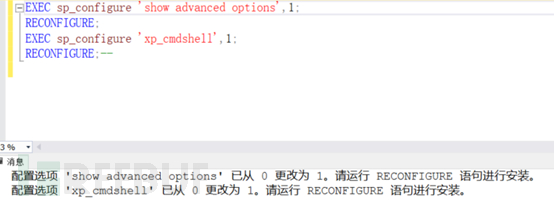 Xp_cmdshell是一个更为有效的查询绝对路径的函数,但是目前已经被SQLServer默认关闭了,但我们可以使用如下命令启用这个选项。