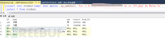 就可以查询c:\目录下的所有符合1*.php的文件,同理,在实际应用中,我们也是新建一个表,并将xp_cmdshell查询到的信息插入后,再次查询即可。