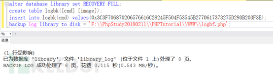 首先需要将数据库设置为完整恢复模式,然后创建一个新表,将WebShell用Ascii编码后写入其中,然后将该数据库的日志信息导出到Web目录,即可。