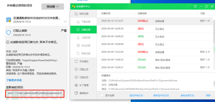 然后直接运行生成的powershell脚本,微软的Defender跟360都直接秒杀了