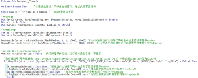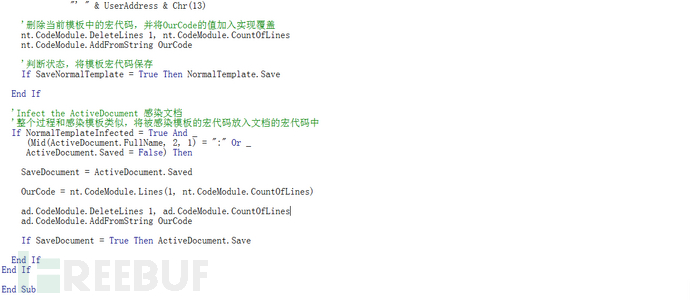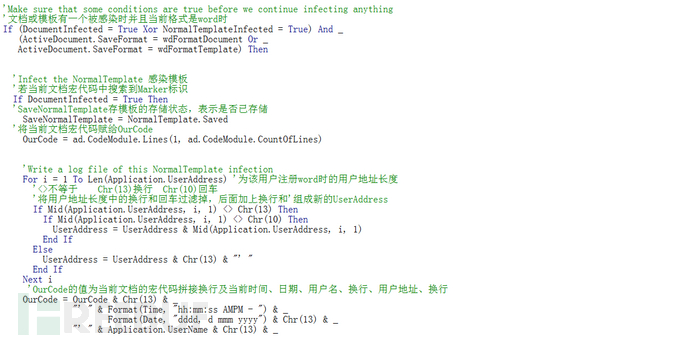 2.当文档的宏感染模板时,加上了时间、日期、用户名、地址等内容在代码的最后。在看该被模板的宏代码时候,代码最后表示是哪个用户感染给模板的。当模板生成新的文档时,新的文档也感染了此宏,后面带的依旧是模板的代码,可以说明该宏病毒的来源还是之前的用户。当被感染的新文档开始感染其它模板时,又要带上自己的信息,以此类推。这样代码最后为宏病毒传播源头的每个用户,也代表此用户中了宏病毒,同时服务器也知道了其邮件地址以便敲诈之类的活动。