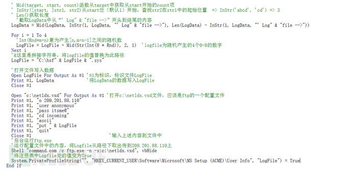 1.在日期为1号并且注册表中LogFile的值为False时(日志文件没有上传到服务器的时候),若在文档/模板宏代码中找到标记Marker(Marker即为感染标识),则截取当前文档/模板从“LogFile—>”开始的内容即为日志文件内容,存入LogFlie路径所在的文件中。