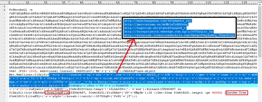 在下图中,我们可以看到一个攻击者生成的PowerShell代码示例,该PowerShell代码从多个动态生成的URL下载Emotet恶意文件。如果大家想了解有关该威胁的更多信息,请参考我们在去年发表的文章《Emotet恶意软件的新变种分析》。