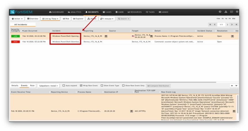 在掌握了恶意攻击者使用PowerShell的各种方式之后,我们就需要确保能正确收集日志,并设置正确的安全控制。用户如果使用EDR技术或MDR服务,将有助于防御或检测并响应所有与PowerShell相关的已知威胁,也包括很多未知威胁。同样,用户也可以选择SIEM来实现检测,其中包含许多预先设置的规则,一旦攻击者尝试借助PowerShell执行恶意活动就会触发这样的规则。下图展示了攻击者在尝试利用PowerShell下载内容时,FortiSIEM产生的告警。