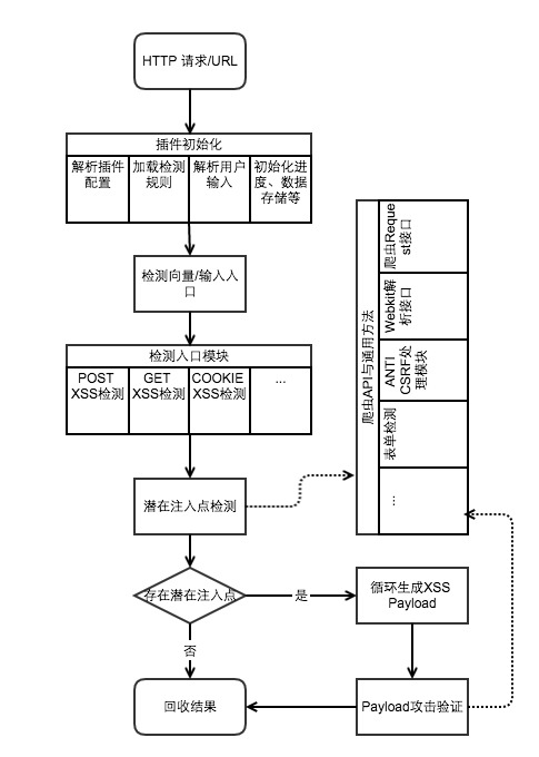 这是一个比较常规的Web漏扫中XSS检测插件的一个流程图,其中比较关键的几个点在于: