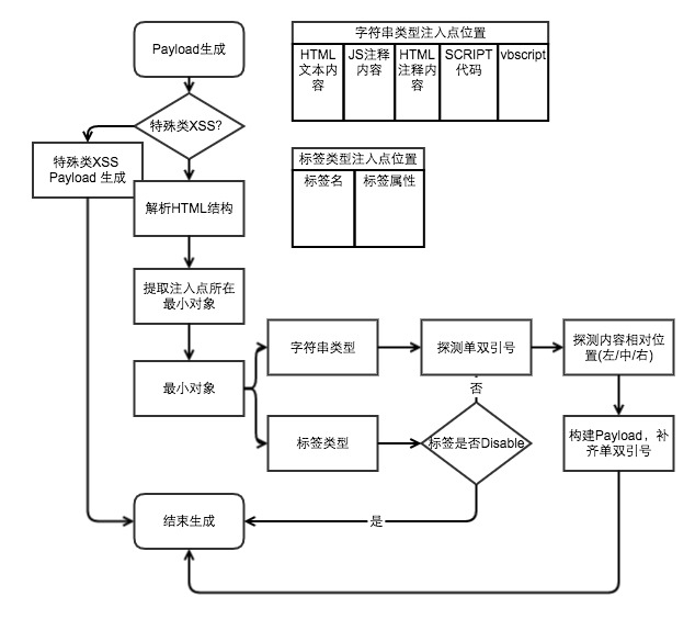 其实Payload的生成就是一个不断Fuzzing和不断调整的过程,根据注入位置上下文代码的结构、内容以及应用过滤机制等不断调整和不断提交测试的过程,下图是一个Payload的生成流程。