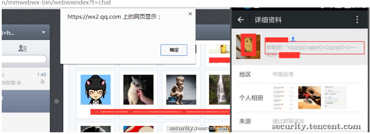 这是一个微信网页版的存储型XSS,注入点是微信昵称的位置(右图),通过访问微信群成员列表可以触发XSS导致弹框。