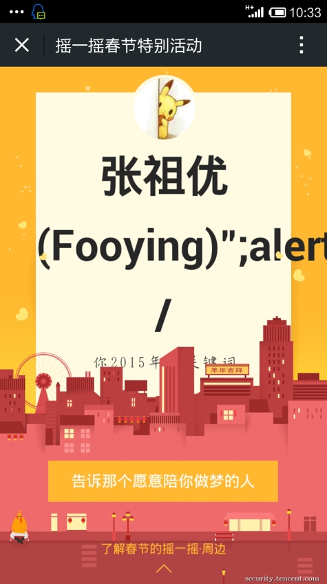),通过微信访问活动页面,自动授权后获取微信昵称并自动显示在活动页面,当时微信昵称是:<h1>张祖优(Fooying)";alert(0)//