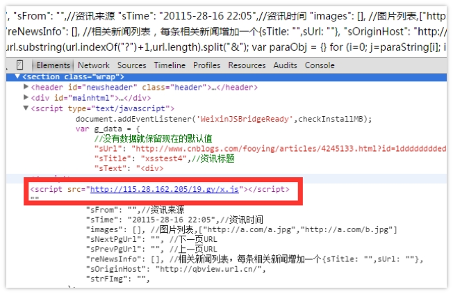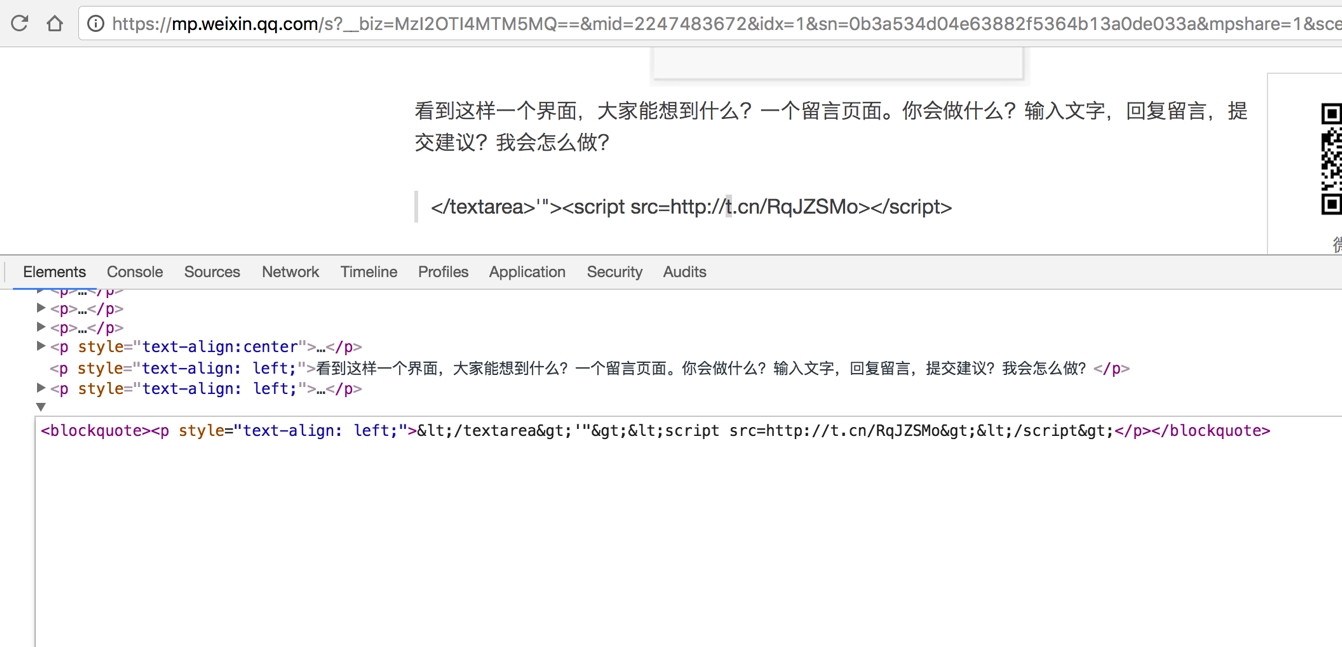 而文章被在QQ中预览的时候,可以发现,被转义的攻击代码又转义了回来(因为这个功能需要只显示文本内容,而删除一些没必要的页面框架、内容的显示,所有对内容有做了一些转码等操作),导致的攻击代码的生效,并由此产生了XSS(其实这类XSS叫做mXSS,突变型XSS)。