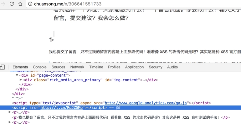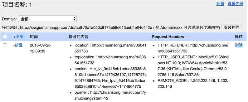 chuansong.me是一个第三方网站,会主动采集微信公众号上的一些文章并生成访问链接和索引,可以看到同样的一篇文章在被传送门采集转载后,本来会被转义的代码直接生效了,于是就成为了存储型XSS,我们通过盲打平台也可以看到其他用户访问这篇文章而被采集并发送到盲打平台的Cookie。