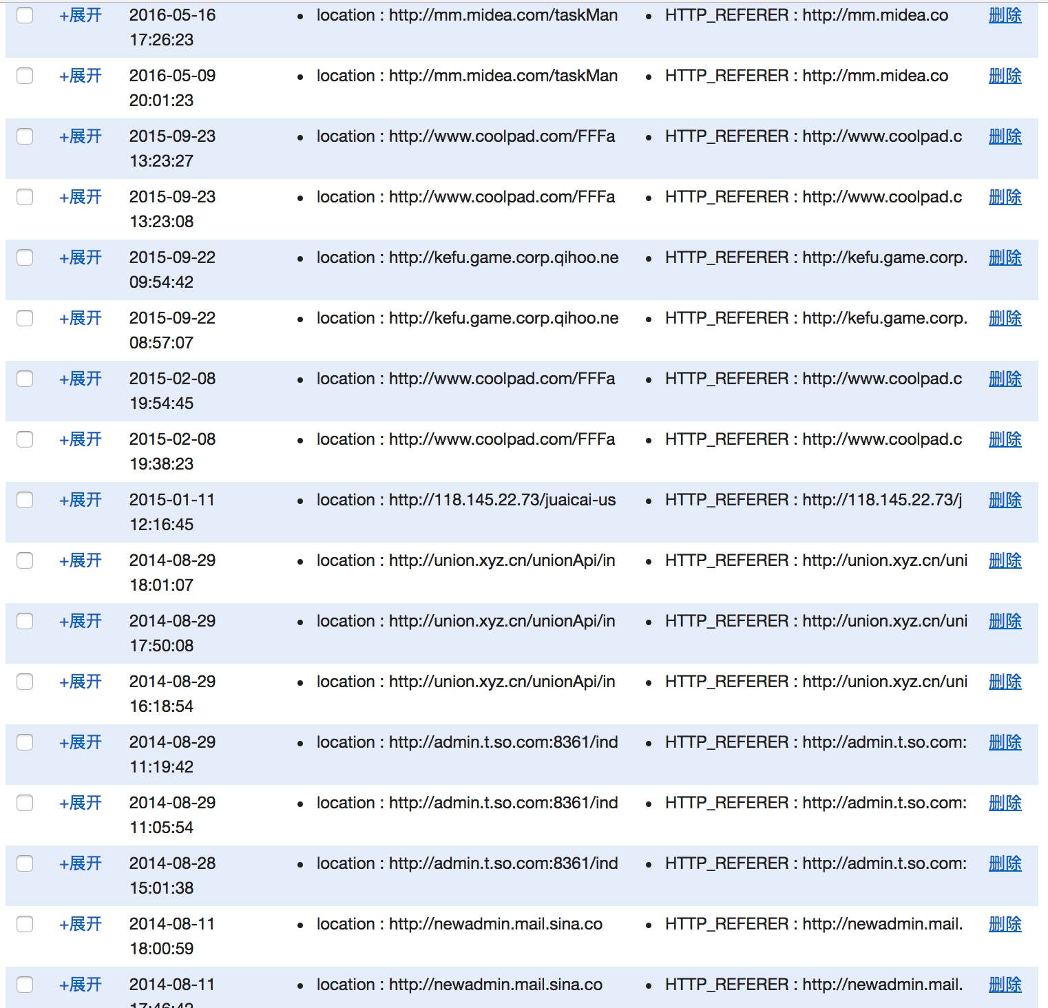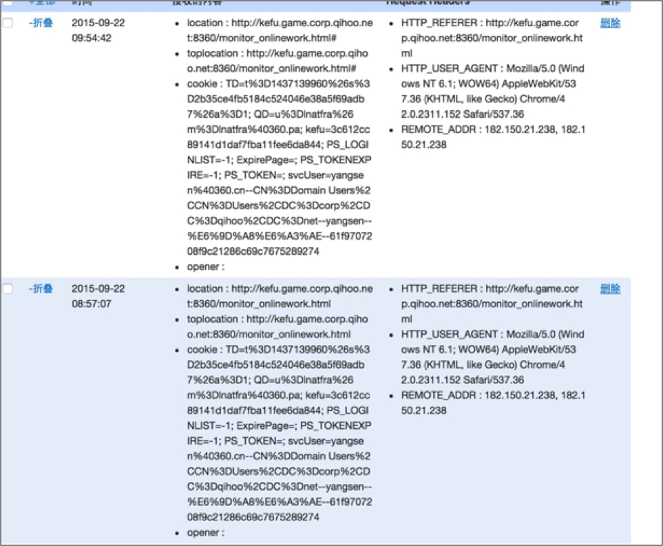 这是我XSS盲打平台项目的其中一页结果截图,这里的每一项都包含对应网址访问用户的Cookie,而Cookie则可以用来直接登录对应的地址;在图里包含了360 soso、360游戏客服、新浪邮箱等几个网站的后台的Cookie,不过可惜的是,由于这些平台进行了访问限制,所以外网无法访问,也无法登录。